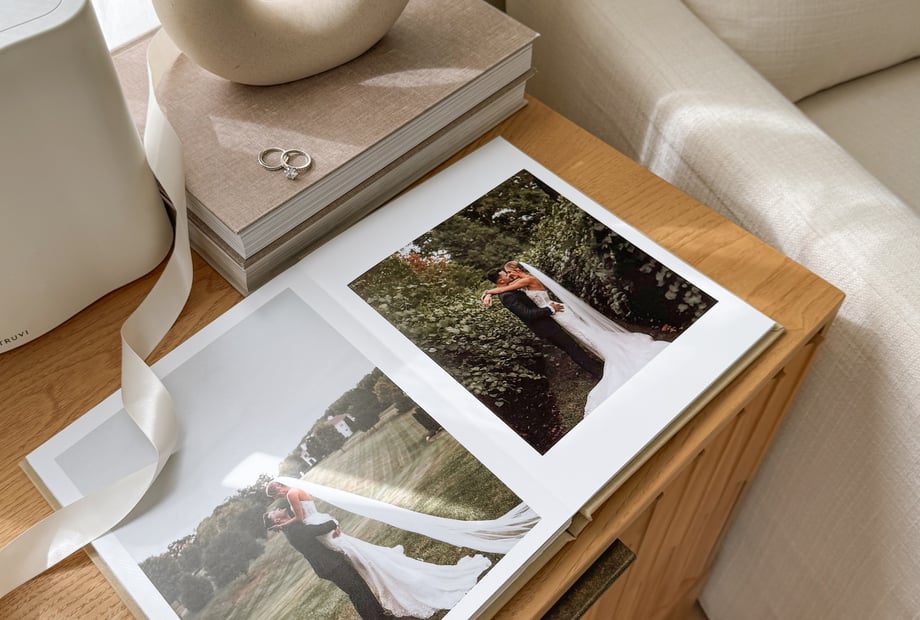 We create premium layflat wedding photo albums designed to turn your wedding memories into something you can hold, share and revisit for years to come. Each album is printed on thick photographic paper so every image flows seamlessly across the page, and finished with beautiful linen covers and elegant foil details.