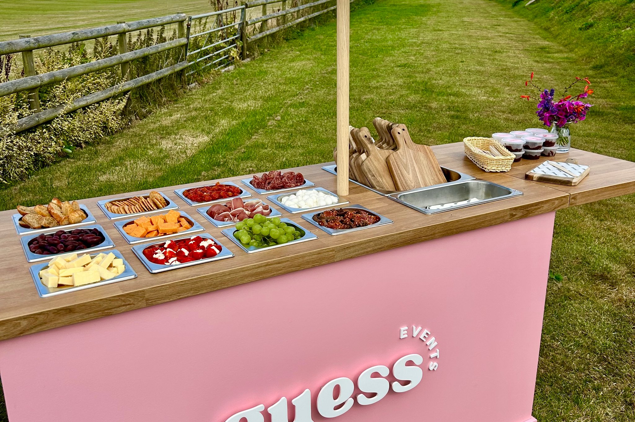Our unique mobile charcuterie bar, where you and your guests can create your very own mini charcuterie board from a delicious selection of prime local meats, artisan cheeses, homemade breads, accompaniments and signature marinades, is the perfect choice for any wedding reception, often a fun alternative to canapés or starters. Fully stocked and hosted by a member of our friendly team, the bar can be set up indoors or outdoors, making it a show-stopping piece for any celebration.