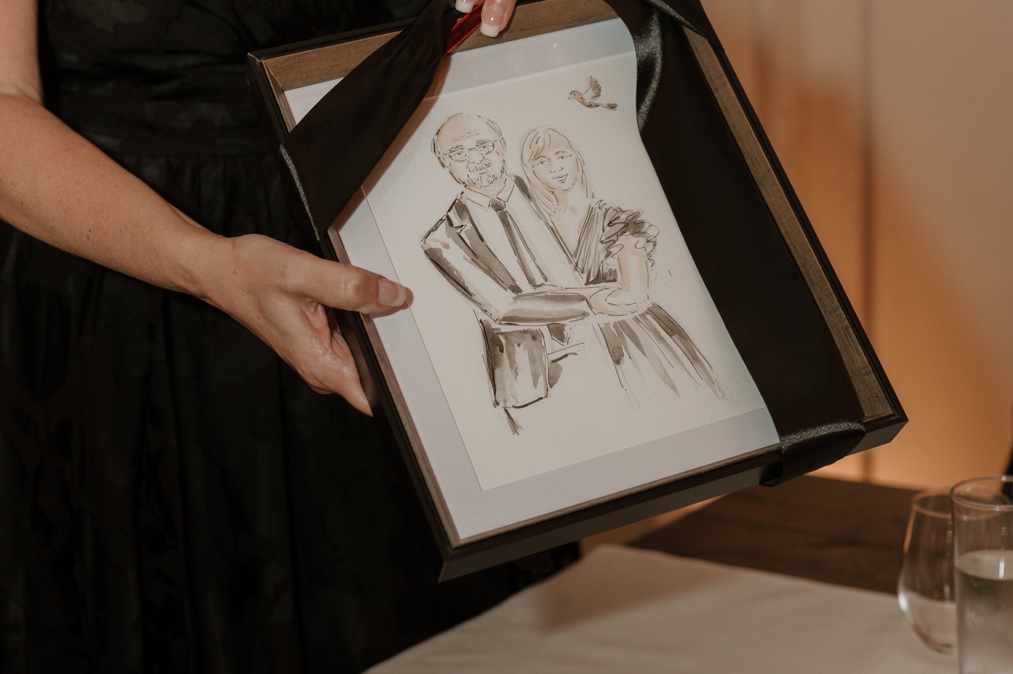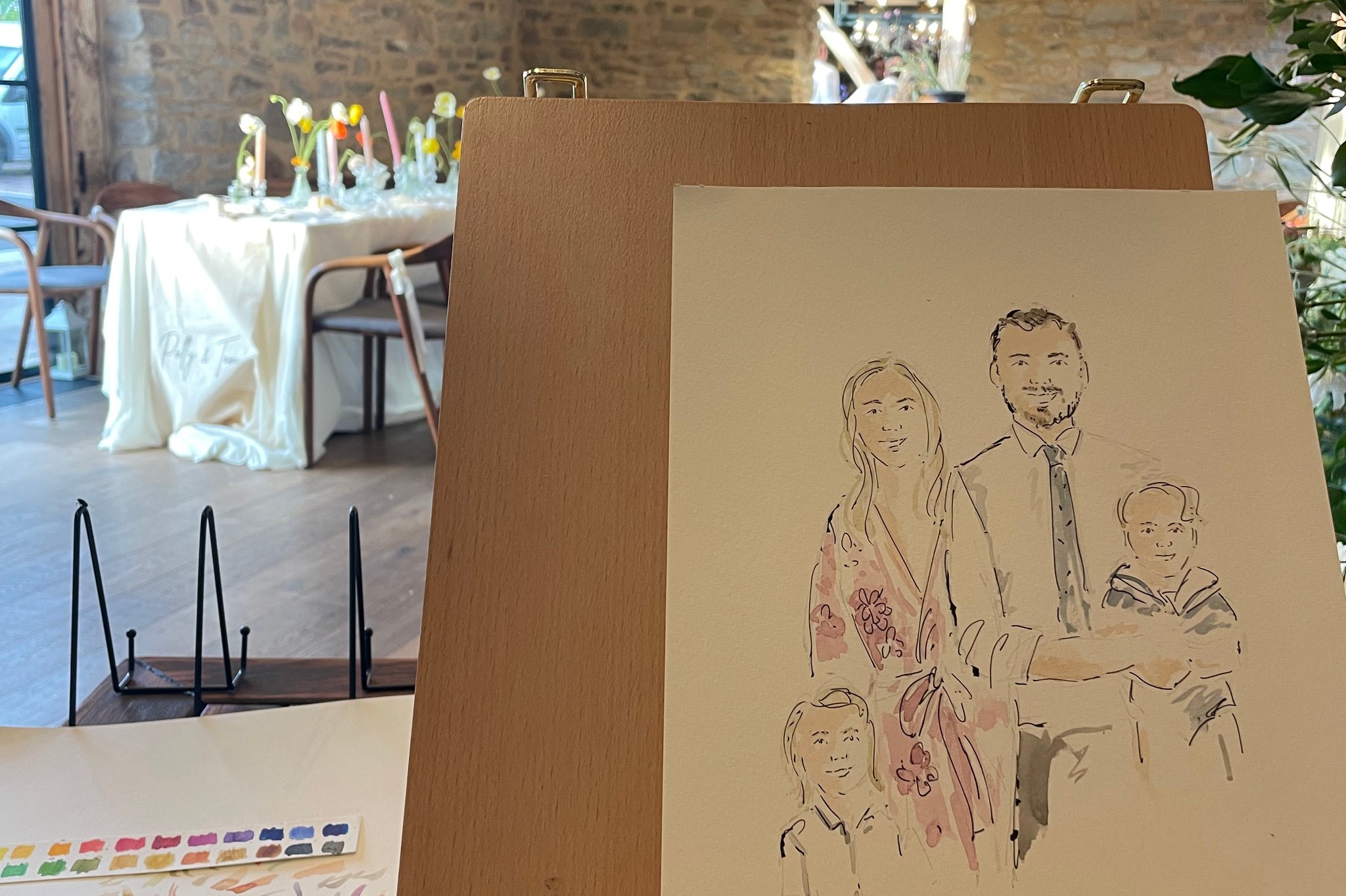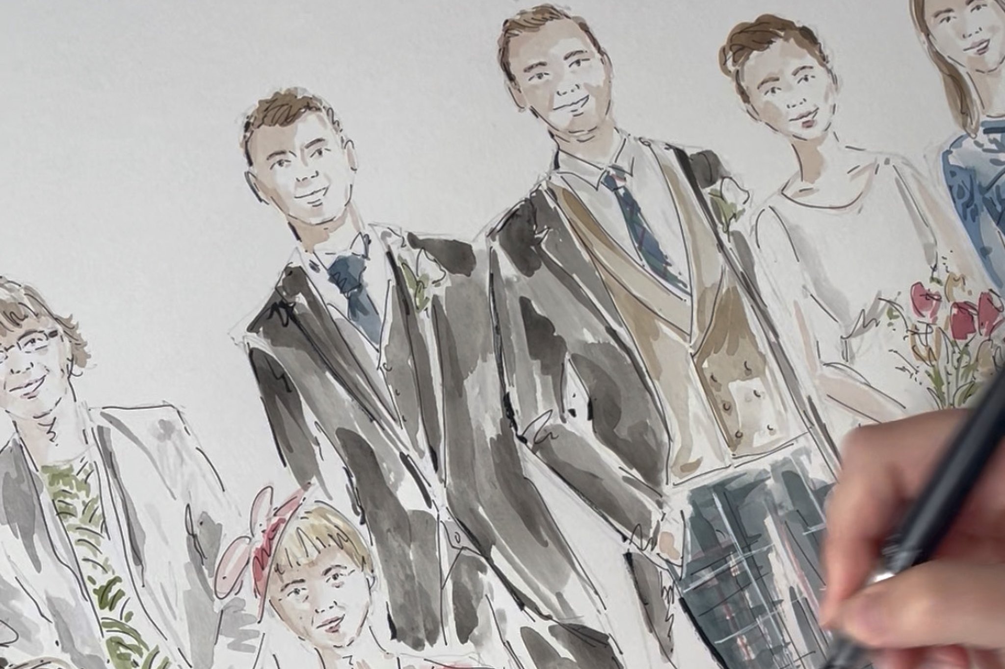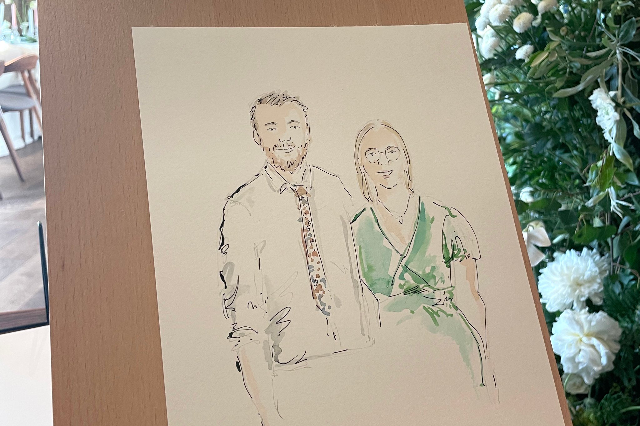 A live illustrator with 10+ years’ experience in art, design and illustration, creating elegant wedding portraits with expressive linework and watercolour that capture each guest’s likeness.