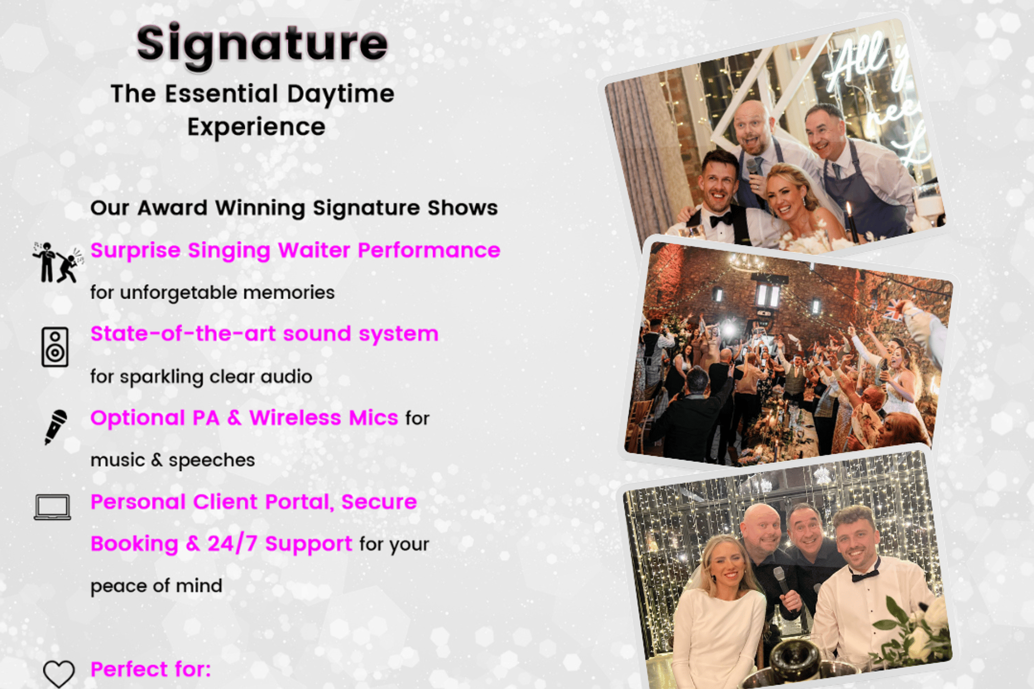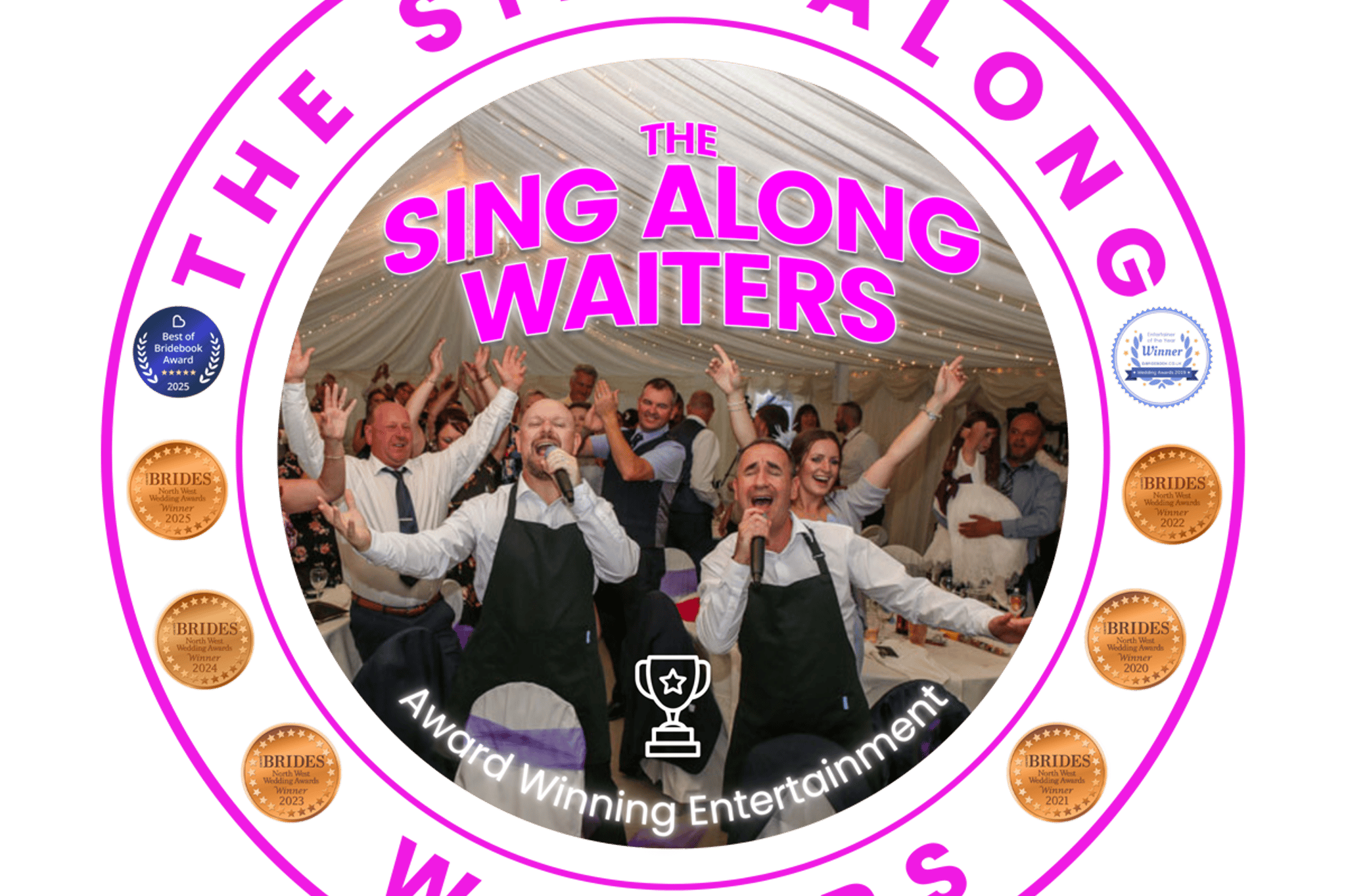 With an impressive client list including Manchester United FC, Bauer Media Group, Twickenham Stadium, Peel L&P, Sport and TV Personalities, Members of the British Royal Family and more than 1000 weddings, it's no surprise that The Sing Along Waiters® are one of the most sought-after double acts in the UK.
