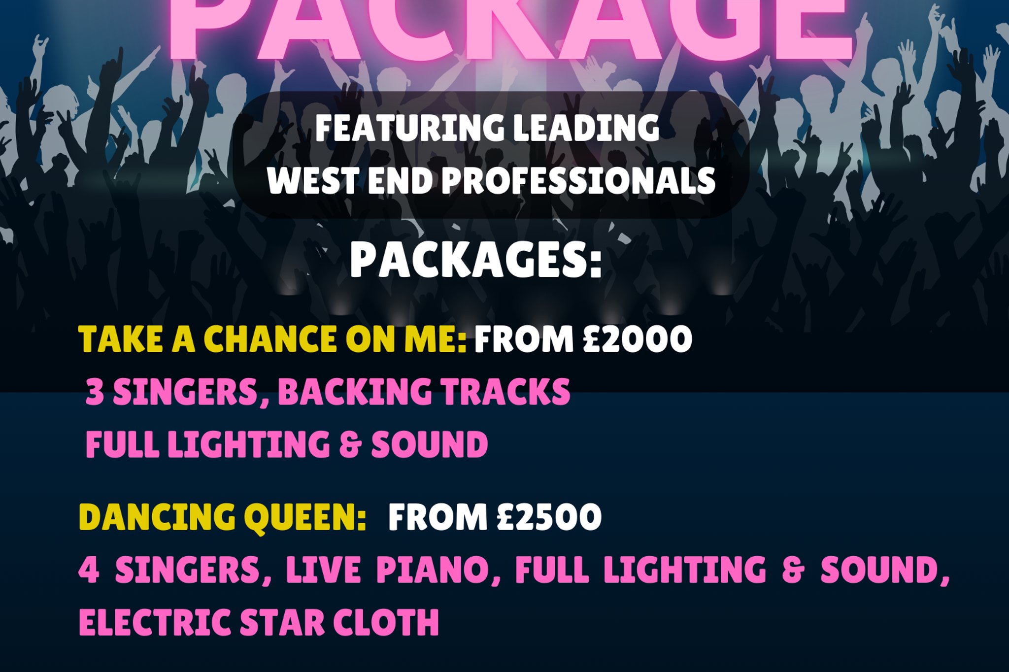 DEFYING GRAVITY SINCE 2015. We are a highly experienced group of seasoned West End performers and musicians who are flexible, adaptable and keen to give you a performance beyond your wildest expectations. West End Musical Events are fully equipped with premium PAT tested equipment public liability insurance, PRS compliant and powerhouse vocals.