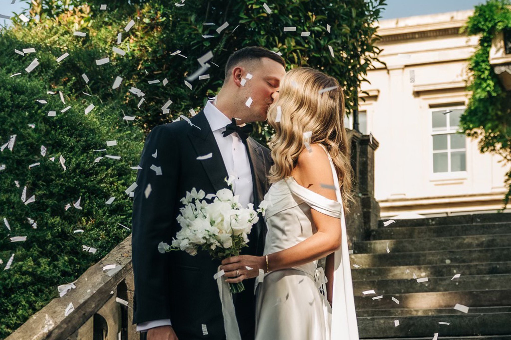 Dancing and twirling with flower petals raining over the couple