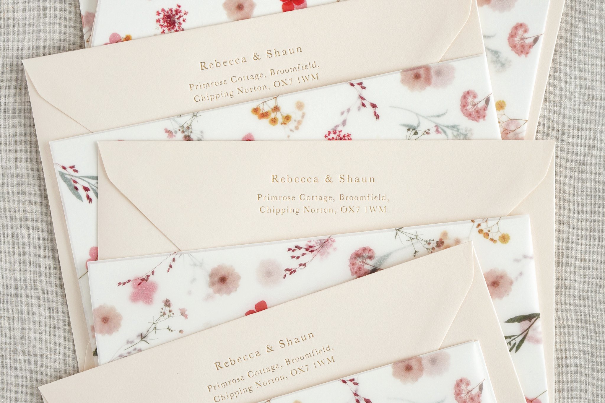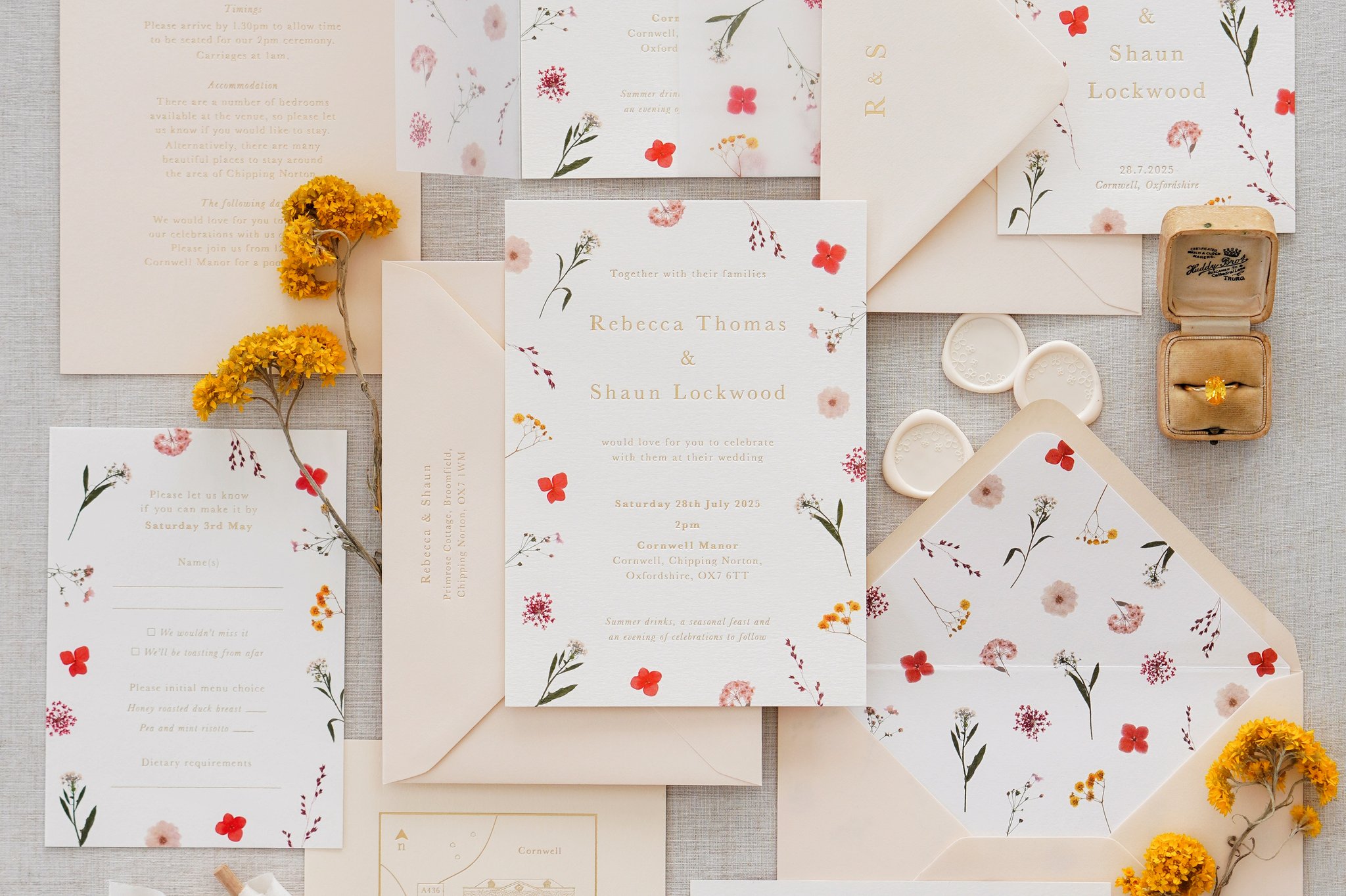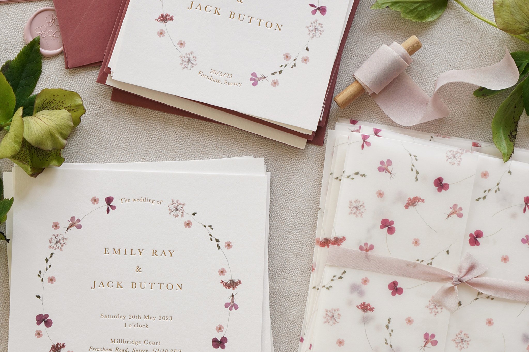 I design floral stationery quite literally from garden to paper! I pick flowers I have grown from my garden, which I then press for a number of weeks. I create floral designs with these digitally, which are are then printed onto luxuriously thick paper and paired with shiny foil blocked wording.