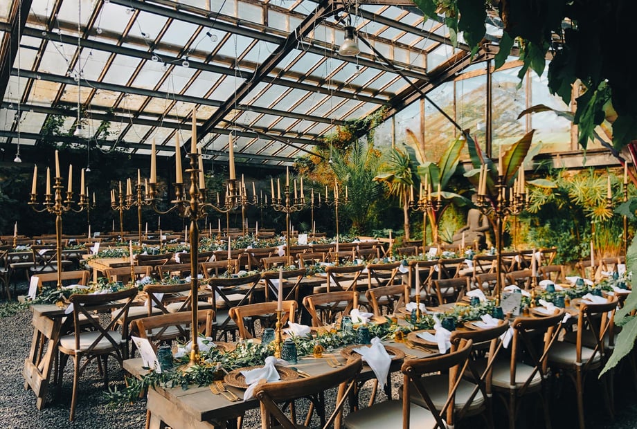 Our light and plant-filled GLASS HOUSE which can be used for cocktail receptions or sit-down meals.