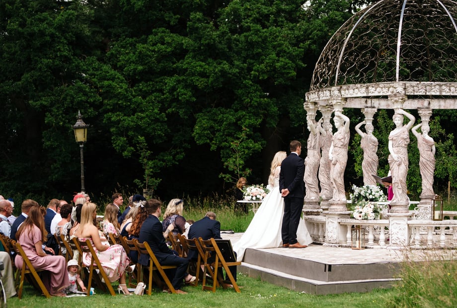 'Aphrodite’s Dome' – a striking structure with an intricately designed dome roof. Picture an intricate pergola entwined with wisteria and clematis. It's such a distinctive and romantic structure and has the backdrop of the orchard. Legal ceremonies can take place outdoors so we suggest using Aphrodite's Dome as the location in good weather. Other popular photo spots are the tree swing, Victoria summerhouse, sparkling fountains and from the top of the spiral staircase looking out across Monmouthshire.