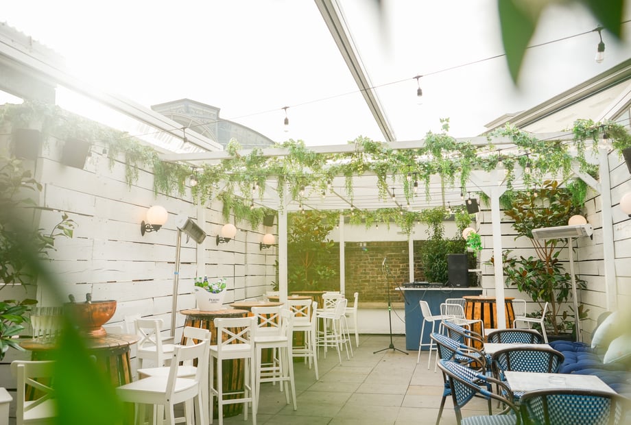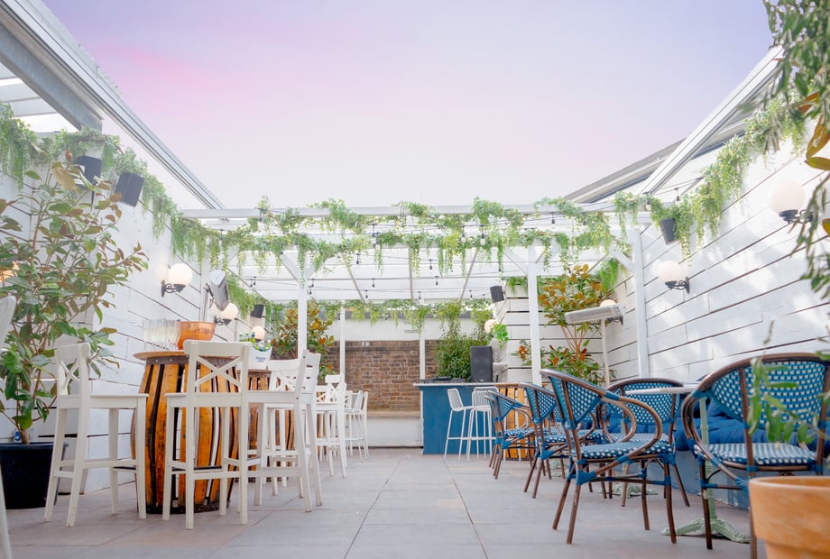 The rooftop terrace at Bubba Oasis features a fully retractable roof and heaters, enabling year-round comfort regardless of British weather. It is west-facing, offering magical evening sunset views, and is decorated with gorgeous plants, creating an intimate and cosy Mediterranean or winter wonderland atmosphere. It can accommodate up to 150 guests.