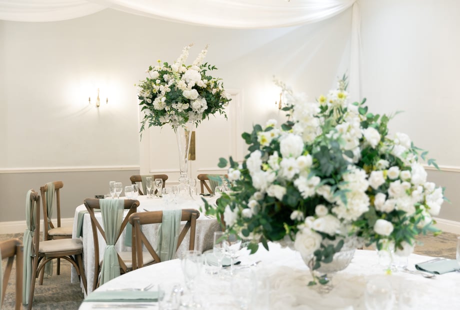 The reception was held in our grand Broughton Suite. The room was adorned with beautiful floral centrepieces featuring blush roses, hydrangeas, and eucalyptus. Twinkling fairy lights draped across the ceiling added a warm and romantic ambience. The couple had opted for a “modern elegance” theme, and every detail reflected it.