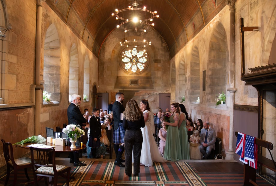Yes, Dunimarle Castle supports both your wedding ceremony and reception in the same breathtaking location, from the charming St. Serf's Chapel to the elegant indoor reception spaces and picturesque outdoor gardens.