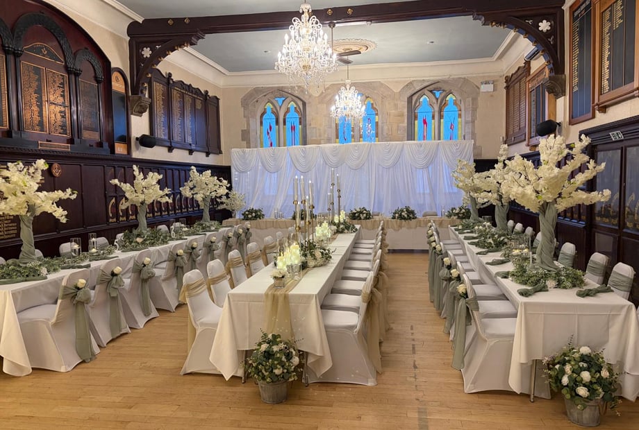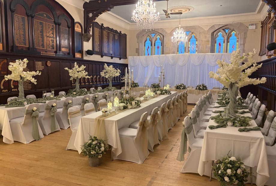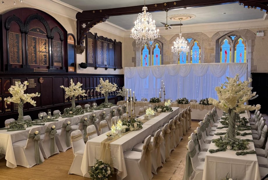 With wood-panelled walls, stunning chandeliers, and breath-taking stained glass windows, Durham Masonic Hall offers a truly unique backdrop for your wedding. Our intimate wedding venue accommodates up to 70 daytime guests and 150 evening guests, perfect for couples who want a venue that feels exclusive yet spacious.
