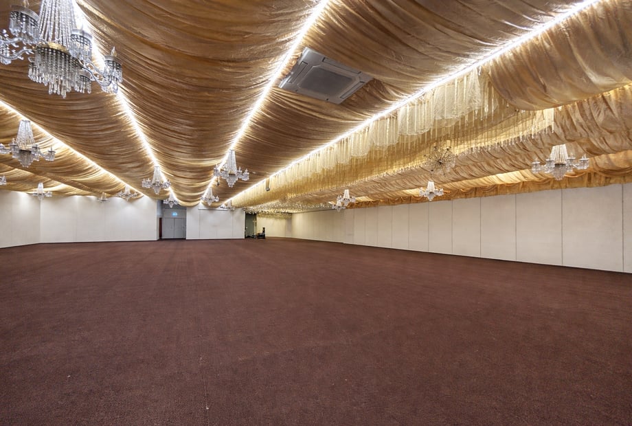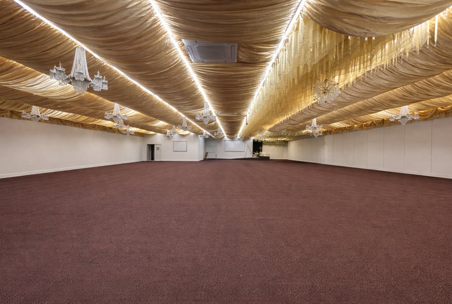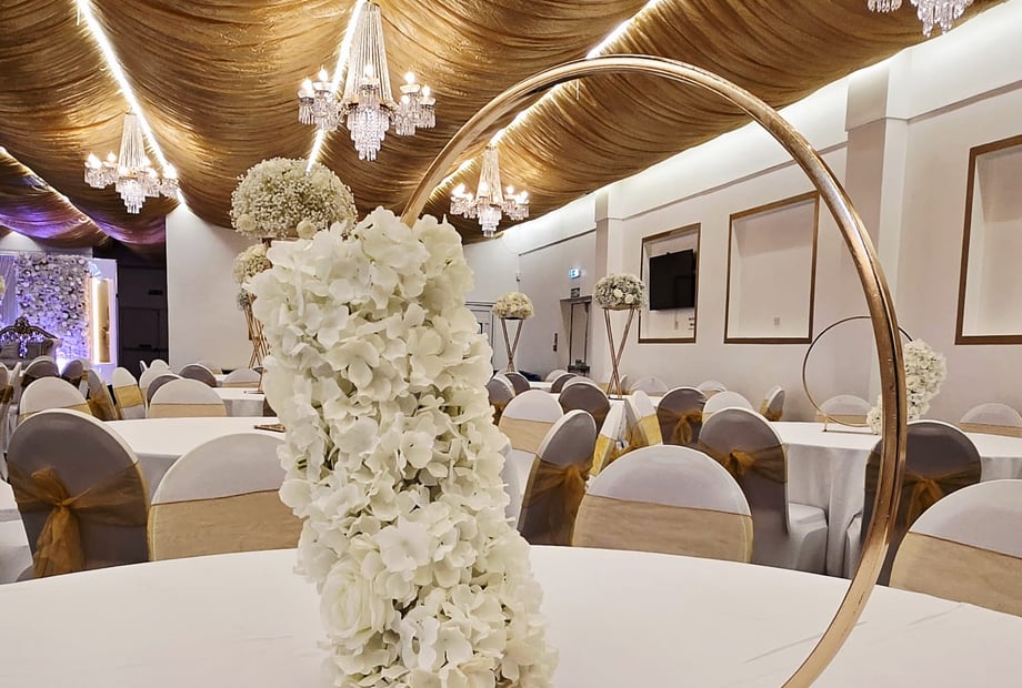 The venue features a stunning marquee-style interior, enhanced by luxurious golden ceiling drapes and sparkling hanging chandeliers, creating a warm and romantic atmosphere that can be tailored to suit any wedding theme. From classic and traditional to modern and glamorous, our venue provides a blank canvas to bring your vision to life.