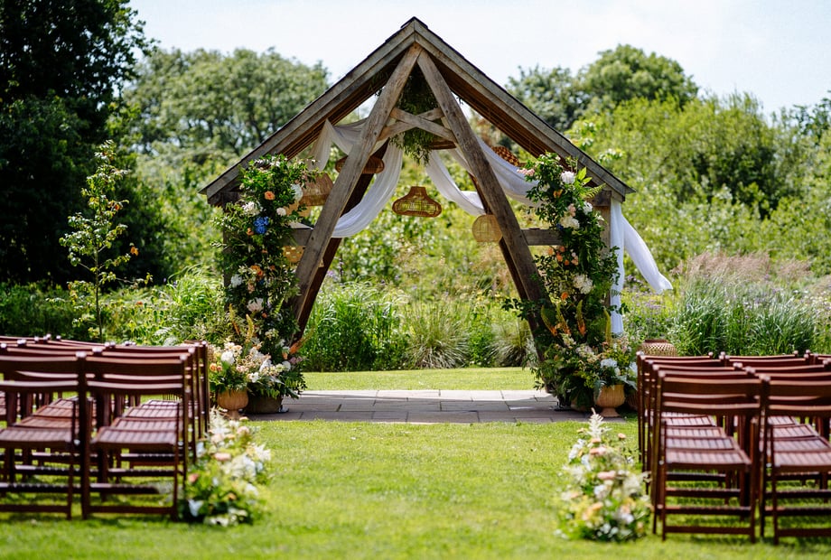 Probably the Pavilion in our flower meadow – it’s where our outdoor ceremonies are held, and it’s such a romantic, peaceful setting. The pavilion is hand crafted from Welsh Oak adding to its rustic charm, and it sits surrounded by wildflowers that change with the seasons. In the evening light, it becomes the perfect spot for dreamy couple portraits. It’s a truly unique feature that captures the heart of our venue