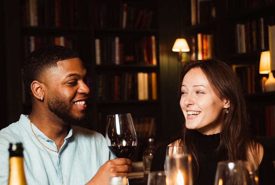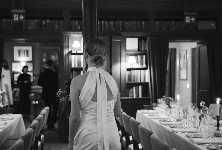 Guests often begin with champagne and conversation in the Club Bar before moving through to The Library for a candlelit wedding breakfast, where long tables fill the room and the celebration gathers pace.