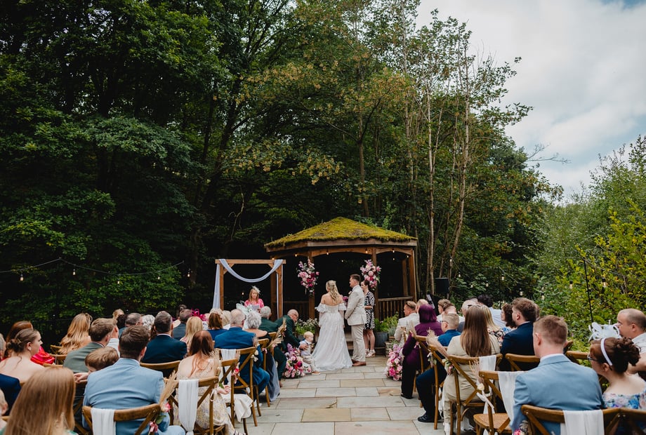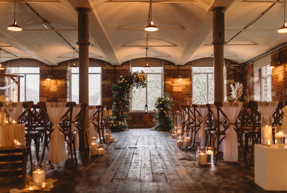 As an exclusive-use venue, the space is entirely yours to celebrate with family and friends. With three wedding licences available, couples can choose the ceremony setting that suits them best. The impressive Bowers Room, once the mill’s carding and weaving room, can host up to 350 guests or be adapted for a more intimate celebration. The elegant Spinning Room, overlooking the rooftops of the historic mill, holds up to 120 guests. For outdoor ceremonies, couples can say “I do” beneath the lakeside pagoda.
