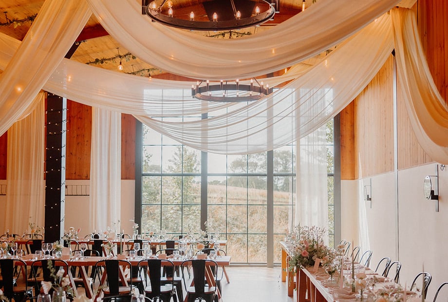 The Stable Barn offers a warm and inviting environment with elegant lighting, warm timber interiors, and captivating views across the paddocks. It includes a well-stocked bar and is the perfect setting for wedding breakfasts and receptions.