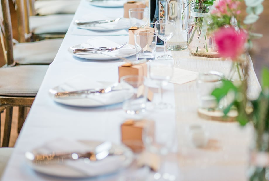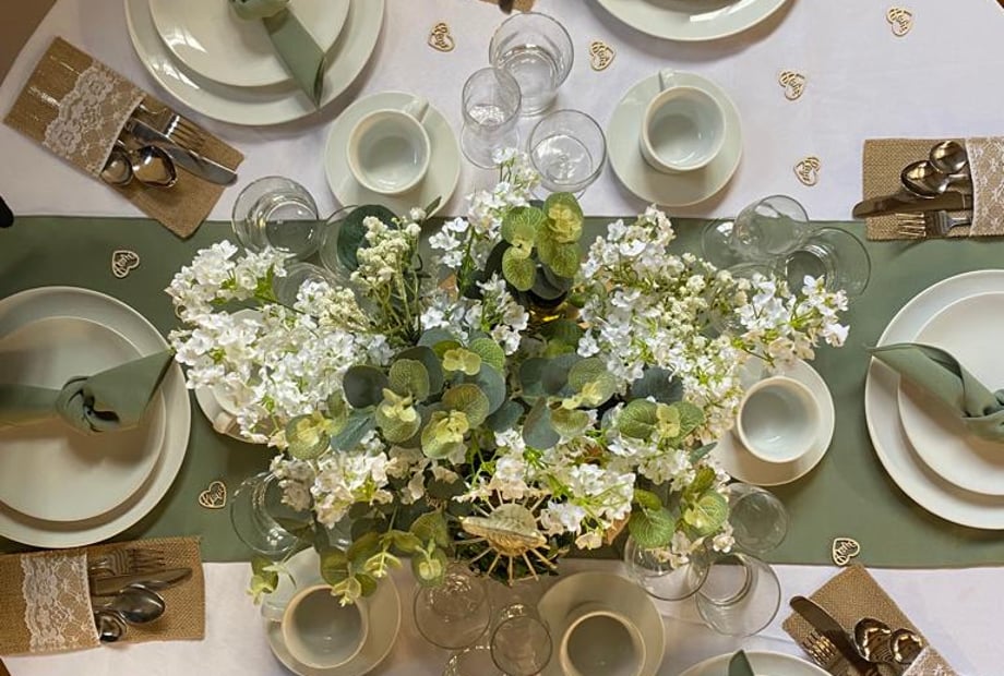 Décor is included in the Flourish and Feast & Flourish packages, with linens, chair covers, runners, centre pieces and a top‑table arrangement.