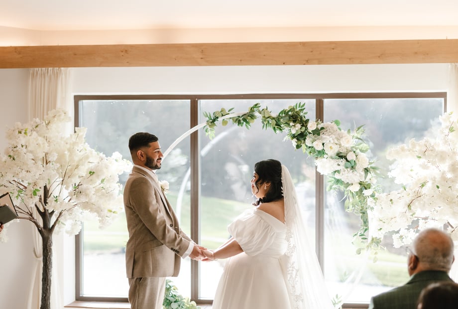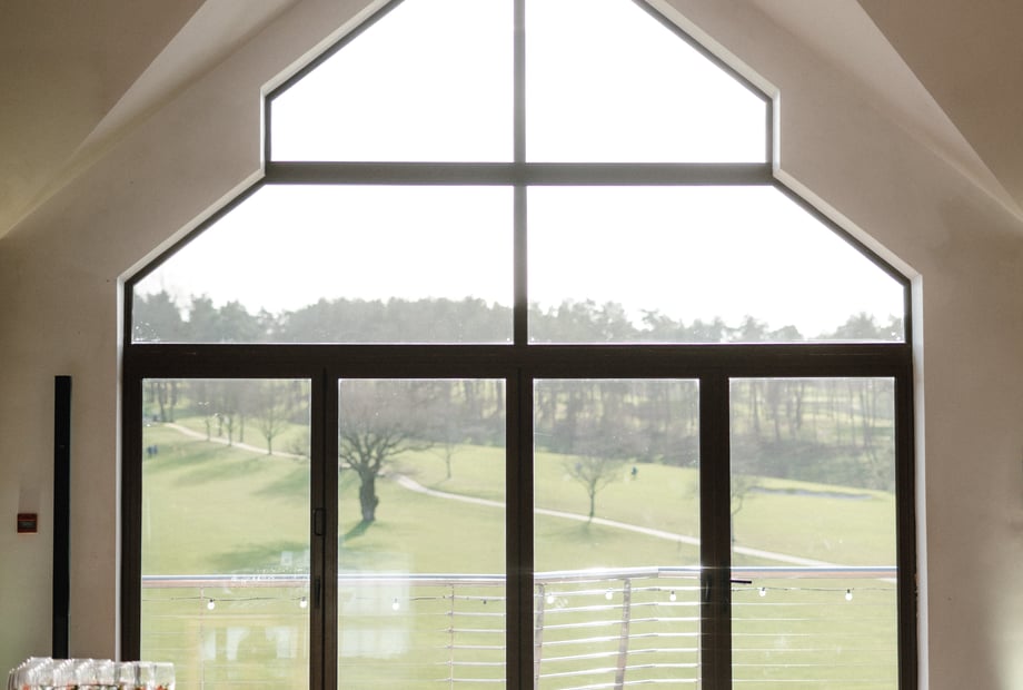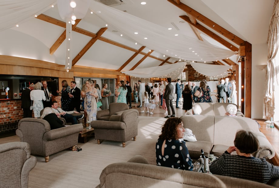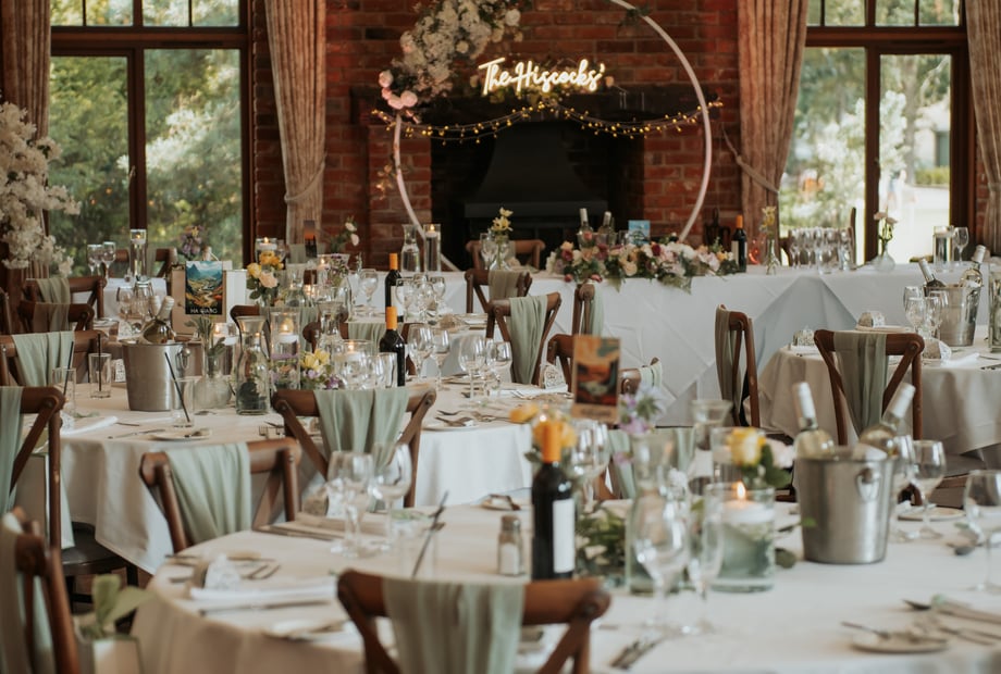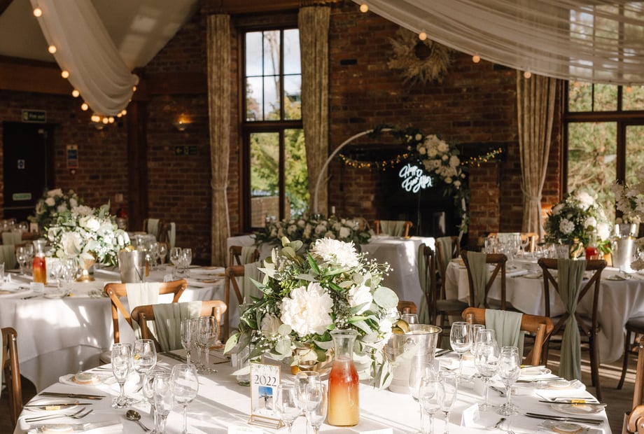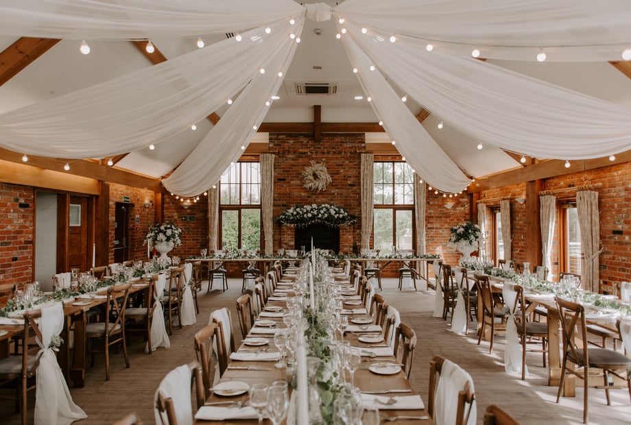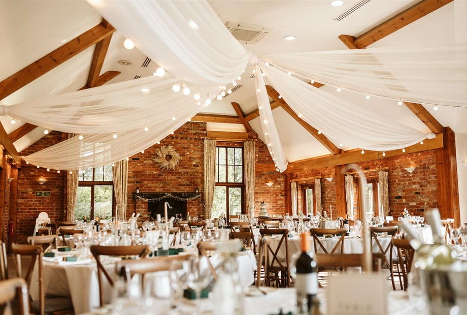 Our beautiful barn-style venue features tall ceilings, exposed oak-beamed ceilings, warm open fire places and large windows that flood the space with natural light, creating a warm and romantic atmosphere. With panoramic views looking across the perfectly kept greenery, your ceremony, reception and photographs will all be set against a truly picturesque backdrop.