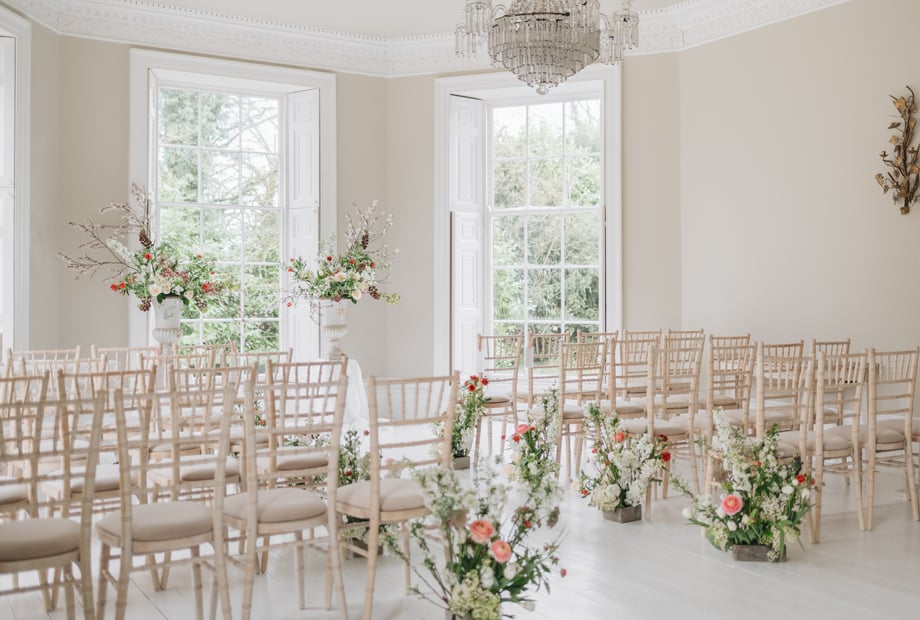 The morning room captures a soft light and has our largest capacity for an indoor wedding in the hall. Accommodating one hundred guests for your ceremony this spectacular space displays original Georgian features, grand fireplace, floor to ceiling sash windows and views over the tennis lawn.